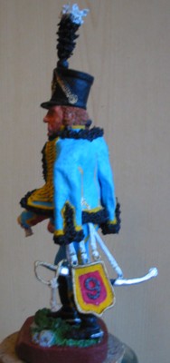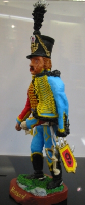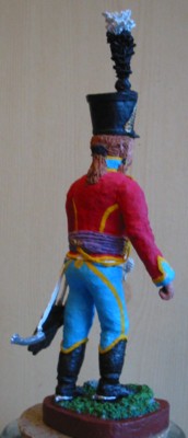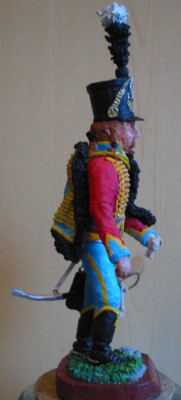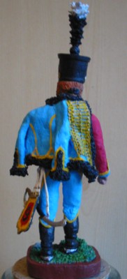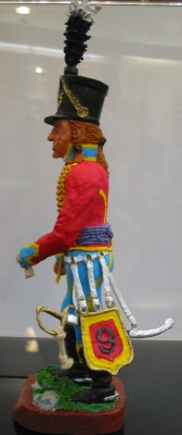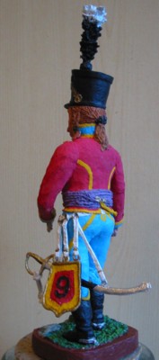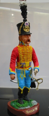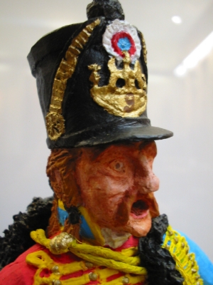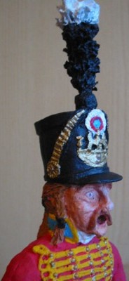Hussard du 9ème régiment, papier mâché, ficelle, fil de laine. Peinture acrylique. hauteur totale, socle et plumet compris: 23cm.