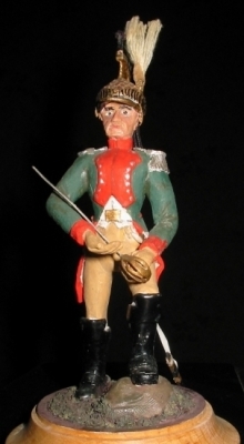 Dragon ; Soldat "habillé" Ma première réalisation en plomb, les éléments du corps, coulés dans un moule de plâtre puis re-sculptés, recouverts de tissus plastifié au polystyrène pour réaliser les bottes et les vêtements, le plumet et la crinière sont en fils. Dragon; from Napoleon's Army, This is the first figurine I made, It's made of lead and tin and plastified cloth. | ||